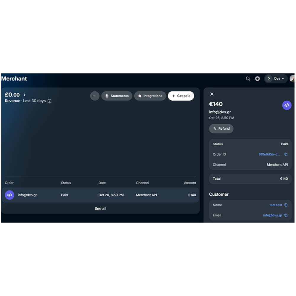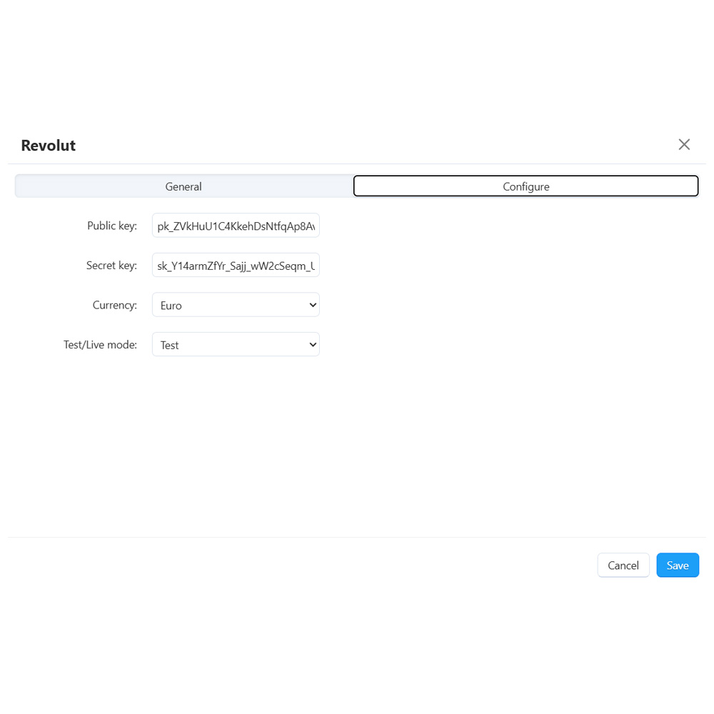 Χρειάζεστε μονο τα 2 κλειδια Public Key και Secret Key απο το Dashboard της Revolut για Merchants.